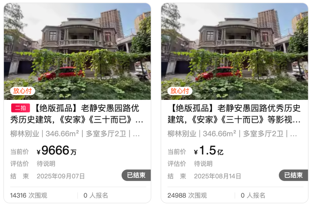 降价超5000万元,上海静安区愚园路一栋优秀历史保护成就因无东说念主出价,第二次拍卖流拍。