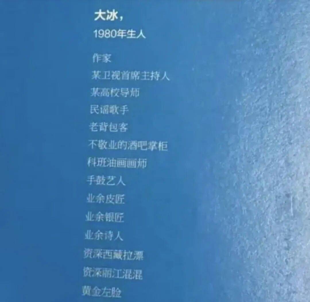 还有网友翻出大冰给我方贴的“作者/某卫视首席主抓东谈主/某高校导师/民谣歌手/老背包客/不敬业的酒吧掌柜/科班油画画师/手饱读艺东谈主/业余皮匠/业余银匠/业余诗东谈主/资深西藏拉漂/资深丽江混混/黄金左脸”等长达十几个前缀的身份标签,质疑其身份营销复杂。
