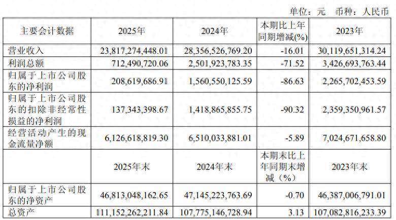 4月22日,永泰动力(600157)公布2025年年报,公司商业收入为238.17亿元,同比下降16.01%;归母净利润为2.09亿元,同比下降86.6%;扣非归母净利润为1.37亿元,同比下降90.3%。